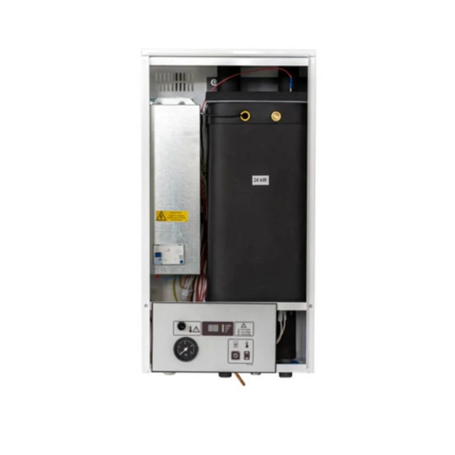 Kombi rendszerű, központi fűtéshez és átfolyó rendszerű használati meleg víz előállításhoz tervezett és kialakított, közel 100%-os hatásfokú elektromos vízteres kazán 18 kW teljesítménnyel. A vezérlő panelen manuálisan három lépcsőben leszabályozható maximális teljesítménnyel.